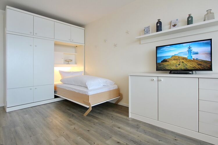In der 5. Etage des Haus Metropol befindet sich diese Einzimmerwohnung mit einem wunderschönen Blick über den Strand und das Meer. Sie verfügt über einen Balkon zur Westseite mit Balkonmöbeln und Sitzauflagen. Der Wohn-Schlafraum ist eingerichtet mit Einzelschrankbetten (Einstieg nur von einer Seite), einem Essplatz mit 2 Stühlen am Fenster sowie einer bequemen Sitzgruppe mit Sessel. Laminatfußboden wurde in der ganzen Wohnung verlegt. Das Badezimmer verfügt über eine Dusche und die Einbauküche im Flur über eine Backofen und ein Ceranfeld mit 4 Kochfeldern. Zur technischen Ausstattung dieser Wohnung gehört: ein Flachbildfernseher, Radio mit CD Spieler. Ein freies WLAN Netzwerk (WEG Haus Metropol - Passwortfrei - ohne Gewähr) steht ihnen kostenfrei zur Verfügung. Größe dieser Nichtraucherwohnung: ca. 34 ².