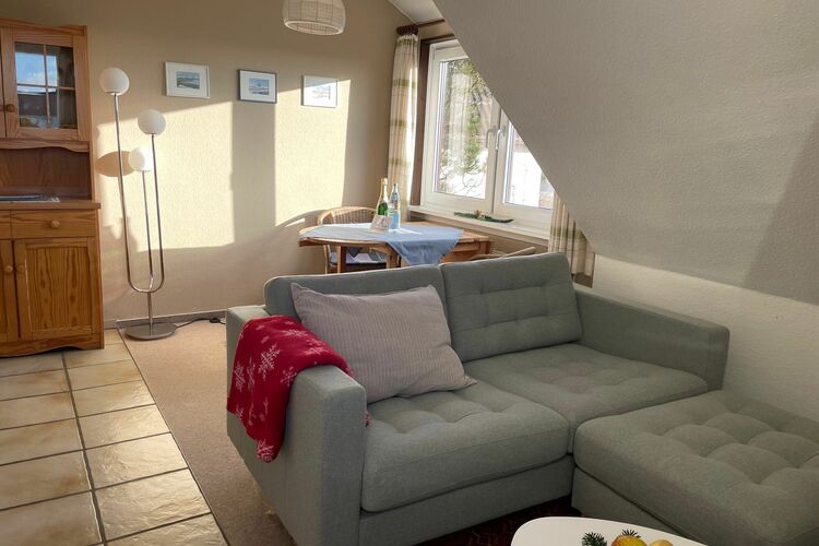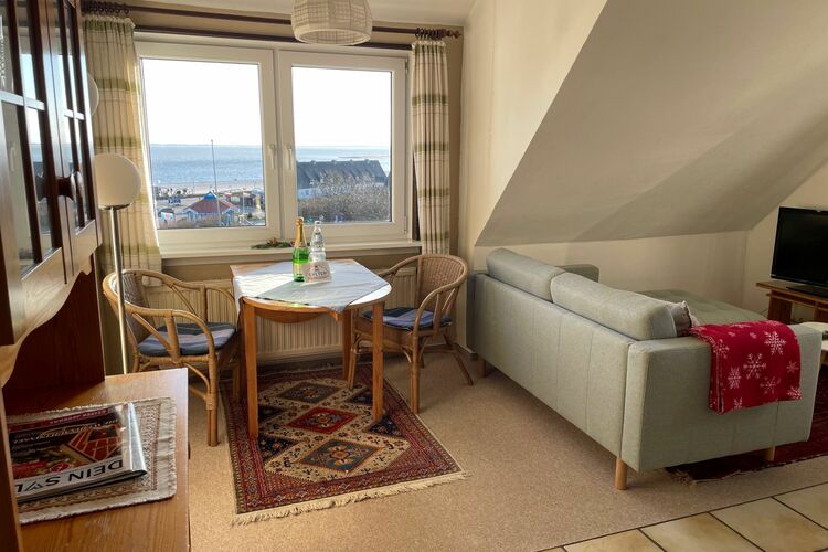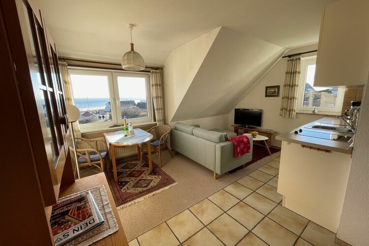 Diese kleine Ferienwohnung für zwei Personen im Haus Meerblick hat zwei getrennte Zimmer, davon ein neues Schlafzimmer mit Boxspringbett, und ein Wohnzimmer mit Küchenzeile.