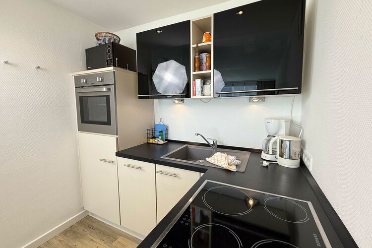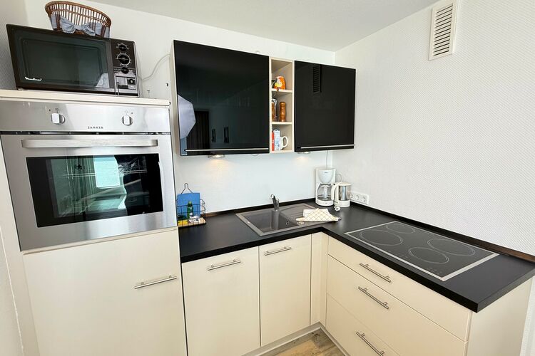 Die offene Küchenzeile ist gut ausgestattet: Geschirrspüler, Mikrowelle, Ceranfeld mit 2 Kochzonen, Kühlschrank mit 3*-Gefrierfach, Kaffeemaschine, Wasserkocher und Toaster stehen bereit.