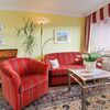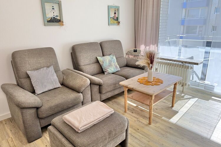 Im Wohnzimmer erwarten Sie eine gemütliche Sitzecke mit 2-Sitzer-Sofa und Sessel, ein Essplatz sowie ein bequemes Doppelschrankbett (ausklappbar, mit getrennten Matratzen). Für Unterhaltung sorgen Sat-TV und Radio. Der angrenzende Südbalkon lädt mit bequemen Balkonmöbeln und Auflagen zu sonnigen Stunden ein.