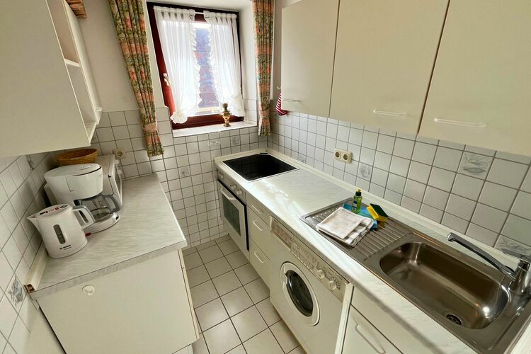 Das separate Schlafzimmer liegt zur Ostseite hin und verfügt über ein Doppelbett mit zwei Einzelmatratzen – ideal für erholsamen Schlaf. Die Küche ist voll ausgestattet und bietet neben einem Backofen und einer Mikrowelle auch eine Waschmaschine mit integriertem Trockner. Ein großer Kühlschrank mit separatem Gefrierfach sorgt für ausreichend Stauraum. Zur Grundausstattung gehören außerdem eine Kaffeemaschine, ein Wasserkocher und ein Toaster.