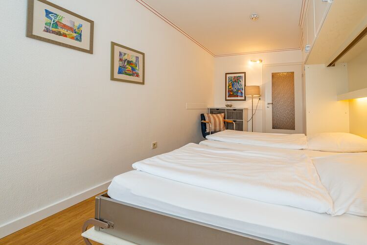 Der Wohn-/Schlafraum besteht aus drei Rattan-Sessel, einem separatem Essplatz, Doppelschrankbett (Betten sind einzeln ausklappbar, spezielle Matratzen für Allergiker, Größe: 1,00 m x 2,00 m), Kabel-Flachbild-TV, Radio/CD.