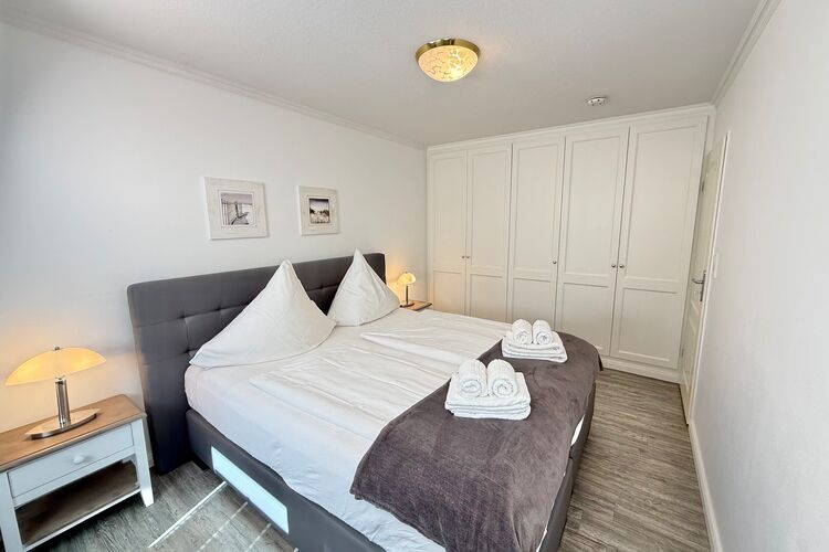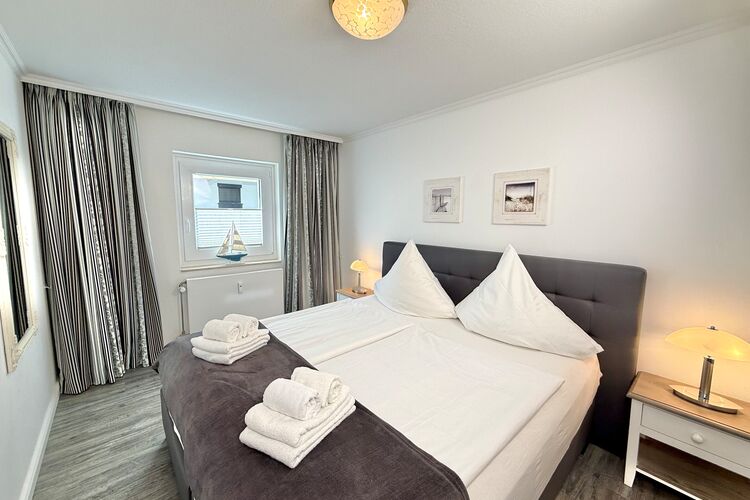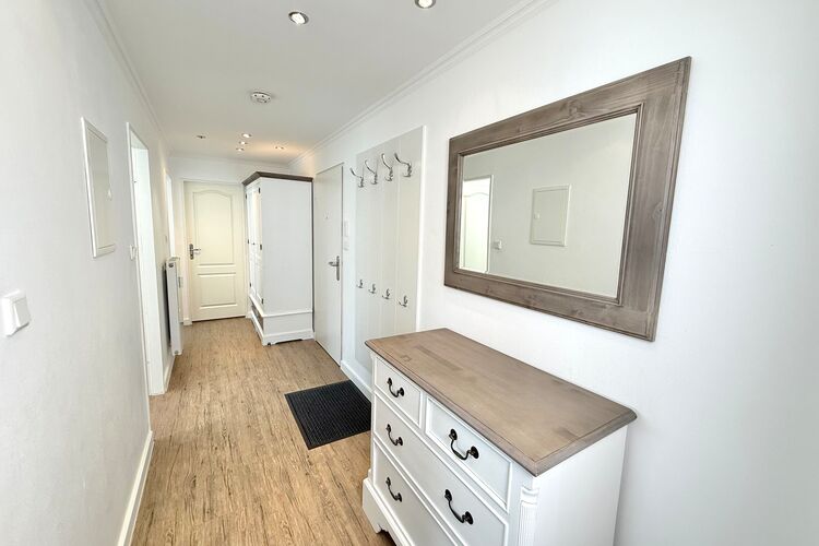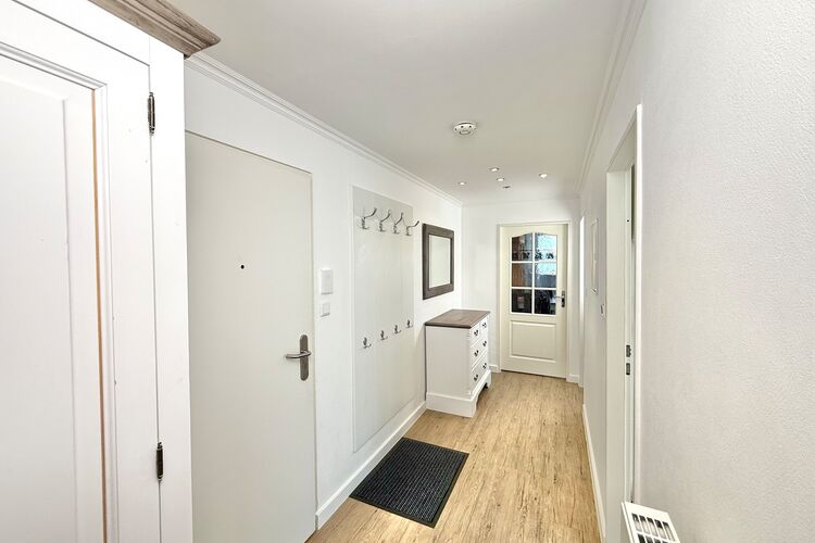 Schick renovierte 3-Zimmer-Nichtraucher-Ferienwohnung, ca. 63 qm, in der 2. Etage zur Landseite mit Ostloggia (Morgensonne, mit Balkonmöbeln und Auflagen) für max. 4 Personen (stufenfrei erreichbar).