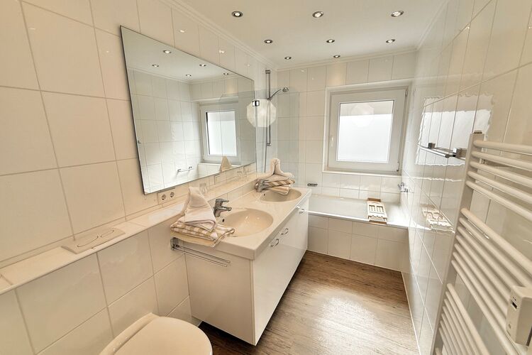 Das neue großzügige Bad hat eine Badewanne mit Duschmöglichkeit und Glastrennwand, einen Doppelwaschtisch, einen Handtuchtrockner, ein WC und einen Fön.