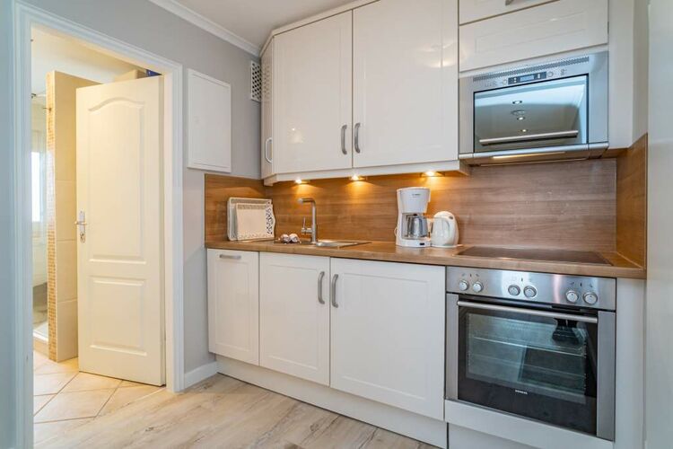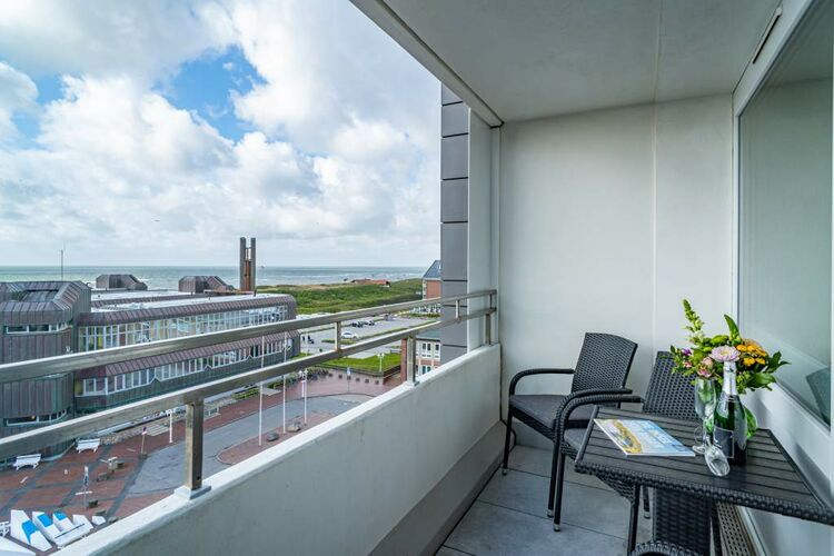 Gut eingerichtete, komplett mit Fliesen und Venyl-Laminat ausgestattete 2-Zimmer-Nichtraucher-Ferienwohnung, ca. 51 qm, in der 5. Etage zur Seeseite mit herrlichem Meerblick und Westloggia (Nachmittags- und Abendsonne mit Balkonmöbeln und Auflagen) für max. 4 Personen.