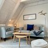 Exklusive Doppelhaushälfte unter Reet im Hampton Style für bis zu 8 Personen. Außen Sylt , innen Hamptons. Über einen kleinen Vorflur mit Garderobe gelangt man in das großzügige Wohnzimmer mit seiner offenen Küche mit den angrenzenden Essplatz für gemütliche Abende. Auffällig und besonders neben der hochwertigen Ausstattung ist das Beleuchtungskonzept sowie die Holzeinbauten mit IPhone - Ladestationen. Im Obergeschoss verfügt über zwei Schlafzimmer und ein Badezimmer mit bodengleicher Dusche. Der ausgebaute Spitzboden verfügt über zwei weitere Einzelbetten. Im Untergeschoss befindet ein Schlafzimmer mit Doppelbett und Schrankeinbauten sowie ein weiteres Wohn und Schlafzimmer. Eine Sauna mit großzügigen Bad ist ebenfalls vorhanden. Der Technik und Hauswirtschafsraum verfügt über eine Waschmaschine und Trockner.