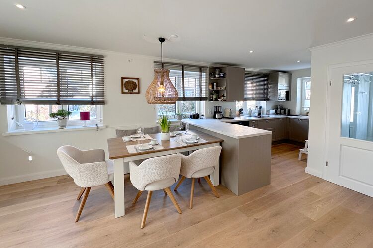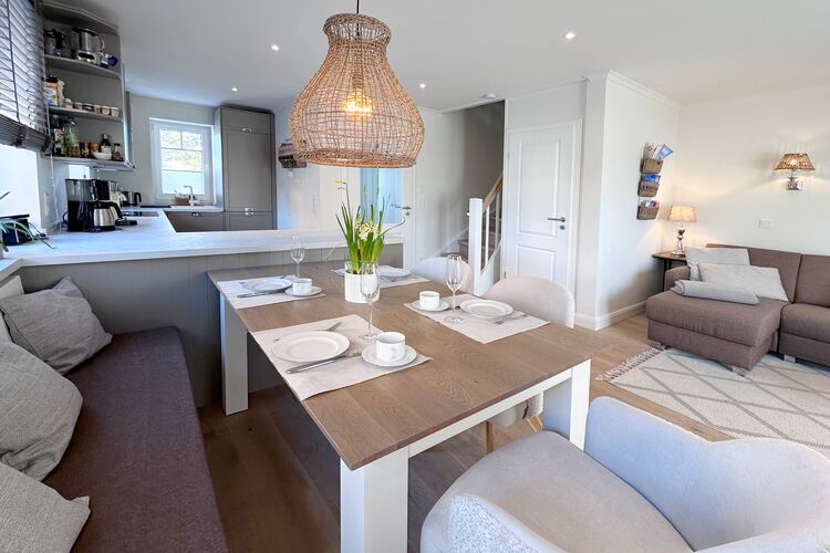 Das Ferienhaus Engels Hüs ist eine Doppelhaushälfte mit einer Nutzfläche von ca. 88m², die Platz für bis zu vier Personen bietet. Das Haus erstreckt sich über 2 Etagen, nämlich das Erdgeschoss und das Obergeschoss. Im Erdgeschoss befindet sich ein Wohnraum mit einem Flatscreen-TV, WLAN und einem Essbereich. Außerdem gibt es hier eine Küchenzeile mit einem Backofen und einer Mikrowelle, einem Induktionsherd, einer Geschirrspülmaschine und einer Nespressomaschine. Des Weiteren gibt es eine Terrasse in südlicher Ausrichtung mit Gartenmöbeln. Ein Badezimmer mit Dusche und WC sowie eine Waschmaschine sind ebenfalls im Erdgeschoss vorhanden.