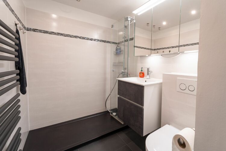 Das moderne Bad überzeugt mit einer großzügigen Dusche mit flachem Einstieg, Spiegelschrank, Waschtisch, Handtuchtrockner und Fön. Ein separates Gäste-WC ergänzt den Komfort.