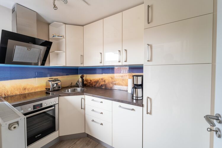 Die separate, helle Tageslichtküche ist vollständig ausgestattet: Geschirrspüler, Backofen, Ceranfeld, Mikrowelle, Kühlschrank mit Gefrierfach, Kaffeemaschine, Wasserkocher und Toaster lassen keine Wünsche offen.