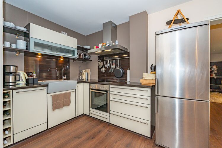 Das Esszimmer ist mit einer offenen Einbauküche ausgestattet, die über alle nötigen Komfortmerkmale verfügt. Hierzu gehören ein Ceranfeld mit 4 Kochfeldern, ein Backofen, ein Geschirrspüler sowie ein amerikanischer Kühlschrank mit Gefrierschubfächern. Außerdem gibt es einen großzügigen Esstisch für 6 Personen.