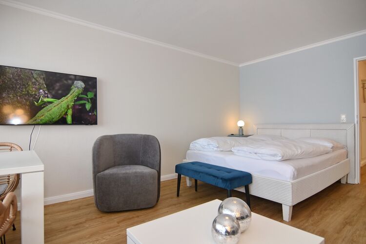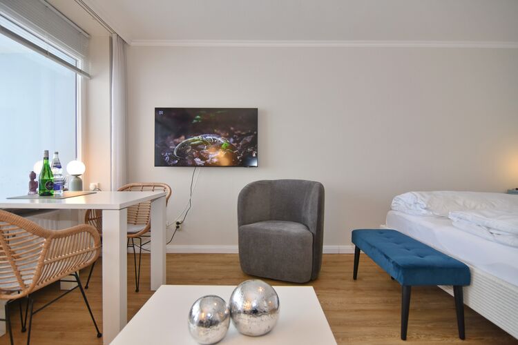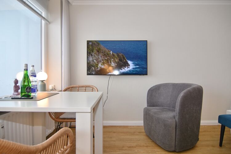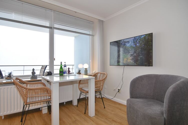 Hübsche 1-Zimmer-Ferienwohnung im "Haus Metropol". Ca. 34m² im 1.OG mit Westbalkon und freiem Meeresblick. Helles Wohn-/ Schlafzimmer mit Doppelbett (2x80x200), Eßplatz am Fenster, 2-Sitzer-Couch und Relax-Sessel, Flat-TV/Radio, W-Lan (ohne Gewähr), Balkon mit Balkonmöbeln und herrlichem Meeresblick, moderne Küchenzeile im Flur mit Geschirrspüler, Duschbad/WC mit Bidet. Das Apartment ist gefliest. Rauchen und Tierhaltung ist nicht gestattet. Bettwäsche und Handtücher sind zur Anreise aufgezogen. Ein PKW-Stellplatz kann kostenpflichtig zugebucht werden.