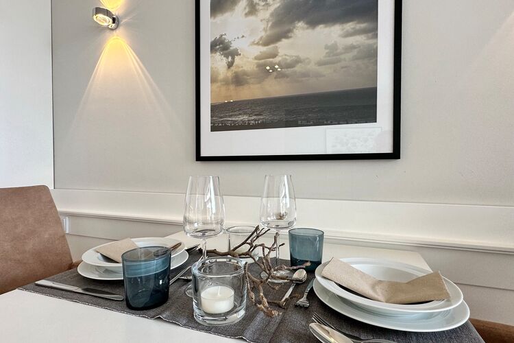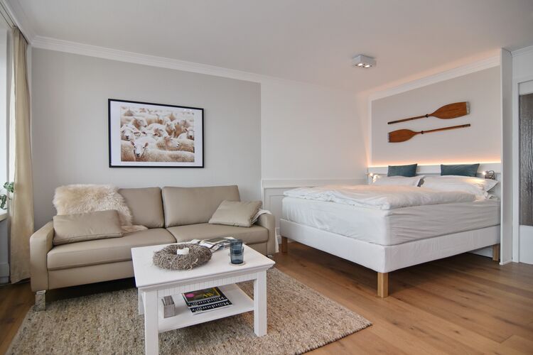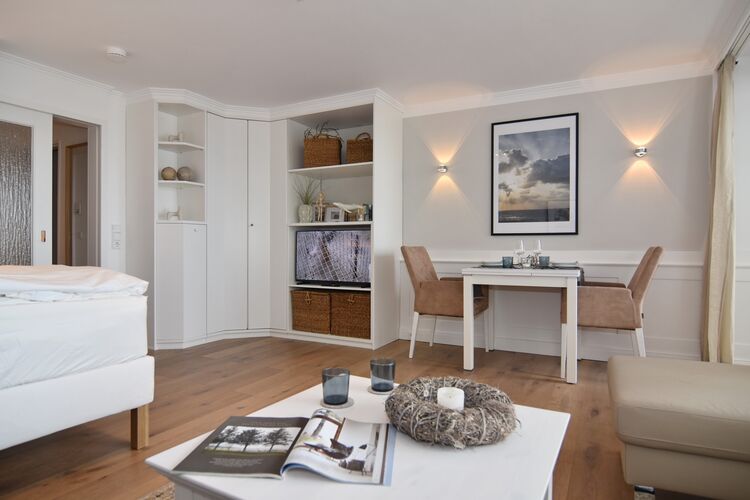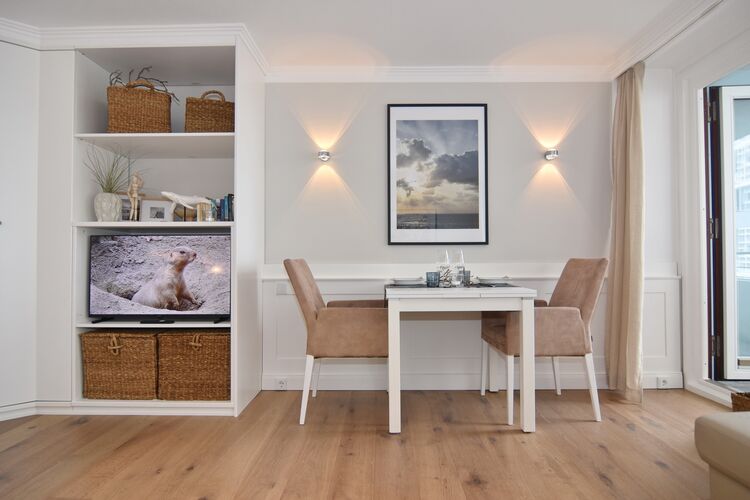 Gepflegte 1-Zimmer-Ferienwohnung im „Haus am Meer“ im 2. Obergeschoss mit ca. 42 m² Wohnfläche. Die Wohnung wurde im Frühjahr 2026 umfassend renoviert und präsentiert sich modern und einladend. Der kombinierte Wohn- und Schlafbereich verfügt über ein komfortables Boxspringbett (160 x 200 cm) sowie eine gemütliche Sitzecke mit Sofa und Recamière. Ein Essplatz, Kabel-TV und Radio sind ebenfalls vorhanden. Vom Westbalkon genießen Sie einen schönen, leicht eingeschränkten Blick auf das Meer. Die separate Küche ist voll ausgestattet mit Mikrowelle, Geschirrspüler, Filterkaffeemaschine und Nespresso-Maschine. Das moderne Duschbad verfügt über ein WC. Die Wohnung ist mit hochwertigen Echtholz-Eichendielen ausgelegt. WLAN steht (ohne Gewähr) zur Verfügung. Tierhaltung ist nicht gestattet. Ein PKW-Stellplatz kann kostenpflichtig dazu gebucht werden. Bettwäsche und Handtücher sind zur Anreise aufgezogen. Eine Waschküche mit Münzautomaten befindet sch im Haus.